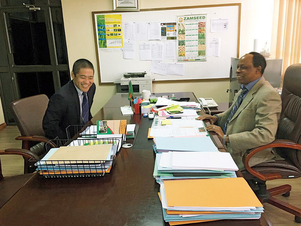 Meeting with Julius Shawa, Agriculture Permanent Secretary. After joining the Ministry of Agriculture, Forestry and Fisheries (MAFF) of Japan, Yutaka Inoue worked on agricultural infrastructure development projects in various regions in Japan. He was sent to Zambia earlier this year after his activities supporting Tanzania and Egypt. Inoue is now the Senior Agricultural Advisor to the Ambassador of Japan and the Advisor to the Department of Agriculture of Zambia, Department of Agriculture, Ministry of Agriculture.