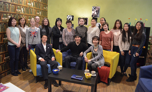 Iwata spends busy but fulfilling days interacting with local residents of Ulan-Ude, the capital of Russia’s Republic of Buryatia, which lies on the edge of Lake Baikal. The man and woman sitting to his right are principal dancers of the Buryat National Academic Opera and Ballet House.