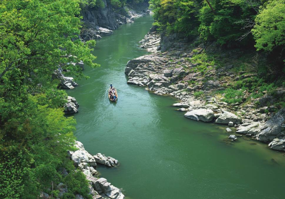 In the center of the Nanshin Region, embraced by the imposing two mountain ranges, the Tenryu river flows from north to south. The Tenryu-kyo Valley, located in an area midway down the river, is a scenic region featuring cliffs sliced out of mountains by strong river currents. The spectacular view of the lush green forests, the massive rocks and strange rock formations is even more exceptional when one gazes over the scenery from a boat descending down the river.
