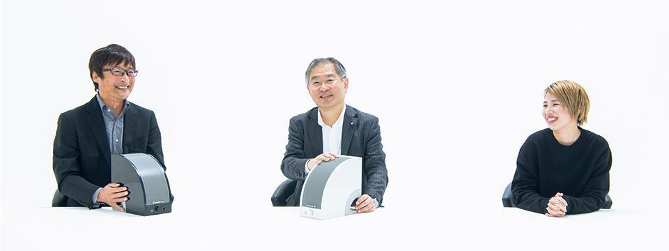 Along with two current Mirai Speaker models in different colors, SoundFun’s president Hiroshi Yamaji, founder Kazunori Sato, and development collaborator Akemi Kumagai. (L to R) https://soundfun.co.jp/