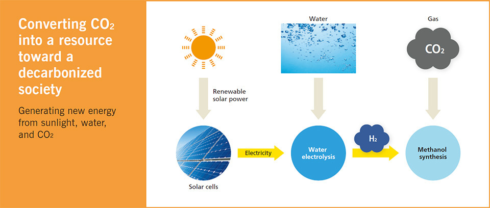 Along with the shift to replace fossil fuels with renewable energies such as hydrogen, another important measure to achieving a decarbonized society is carbon recycling, effectively using CO2 as a resource. In consideration of that viewpoint, Dr. Fujishima has proposed the following method; first, extract hydrogen through water electrolysis using the electricity produced from highly efficient solar cells. Next, combine the extracted hydrogen with the CO2 emitted from power plants and factories to produce methanol, which can be used as an energy source. If this process is realized, gases containing carbon, such as CO2, will no longer contribute to the greenhouse effect. Rather, those gases will become “resources” to replace oil and natural gas.